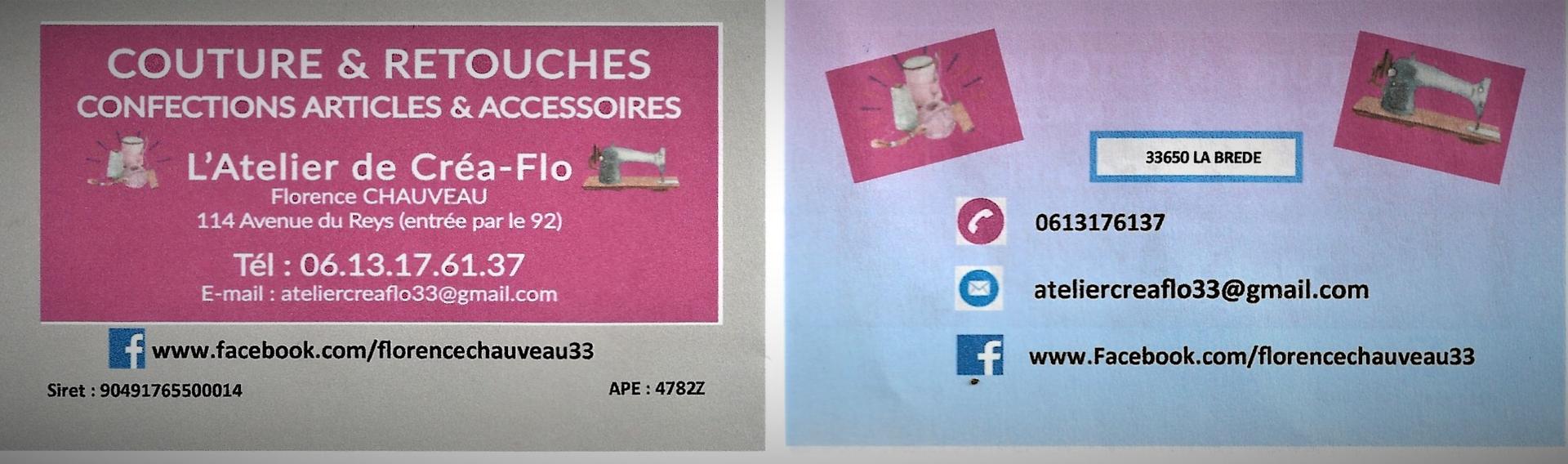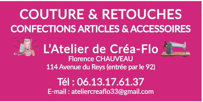 L'Atelier de Créa-Flo situé à 114 avenue Reys 33650 Brède (Entrée par le 92)(la) proposes les services de retouche de vêtement. Sur RDV.