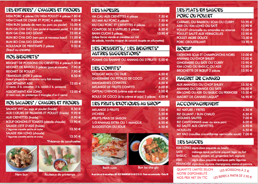 Les horaires d’ouverture de Kim Long, sont fournis à titre informatif, hors périodes de congés. Pour être certain de ces horaires, veuillez contacter directement l’établissement.