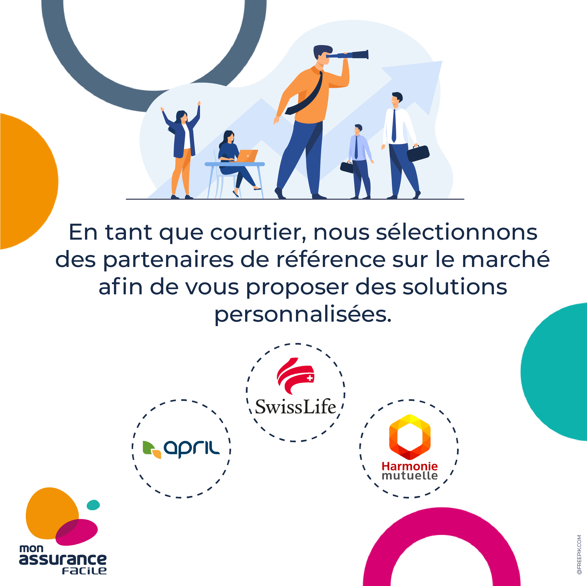 A vos côtés chaque jour! Créé en 2008 sous le nom de Ma santé facile, Mon Assurance Facile est aujourd'hui un coutier spécialisé en Protection Sociale à SORGUES, composé d'un réseau national de 170 conseillers de proximité, experts sur le secteur de l'assurance Retraite, Epargne, Prévoyance et Santé. Grâce à nos agences et à nos conseillers de proximité qui se déplacent sur rendez-vous, notre savoir-faire est près de chez vous! Avec trois partenaires de référence, SwissLife, April et Harmonie Mutuelle, Mon Assurance Facile propose une offre complète et adaptée à tous: particuliers, indépendants, entrepreneurs, entreprises et salariés. Mon Assurance Facile, le courtier qui vous change la vie!