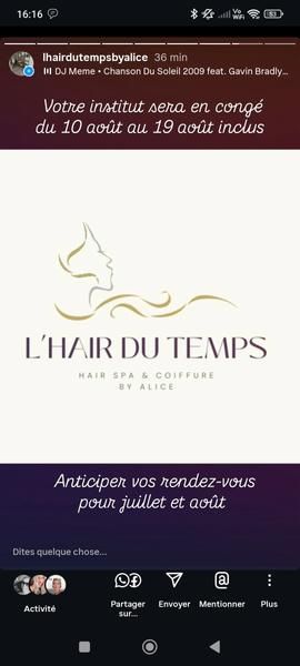 Les horaires d’ouverture de L' hair du Temps, sont fournis à titre informatif, hors périodes de congés. Pour être certain de ces horaires, veuillez contacter directement l’établissement.
