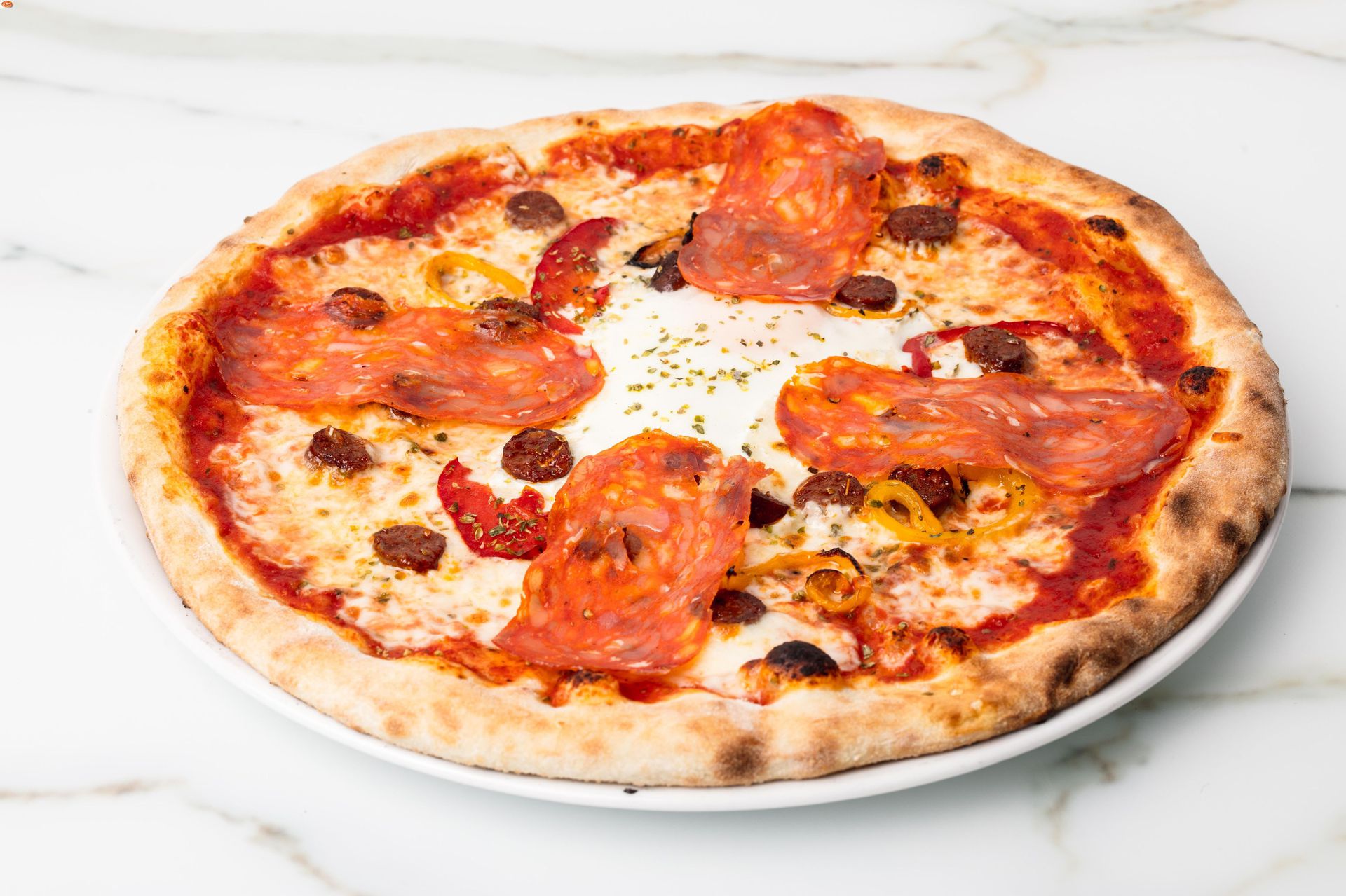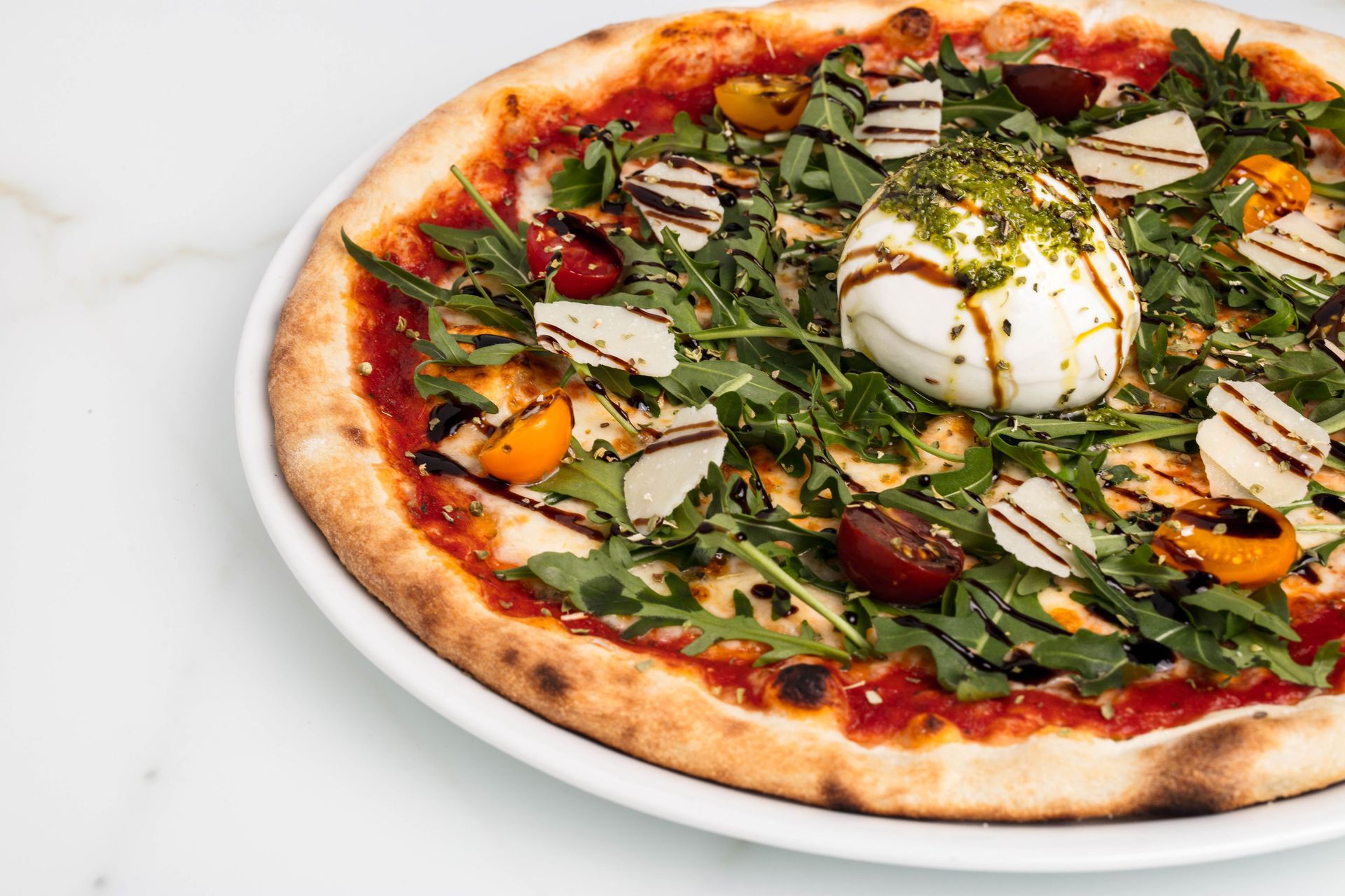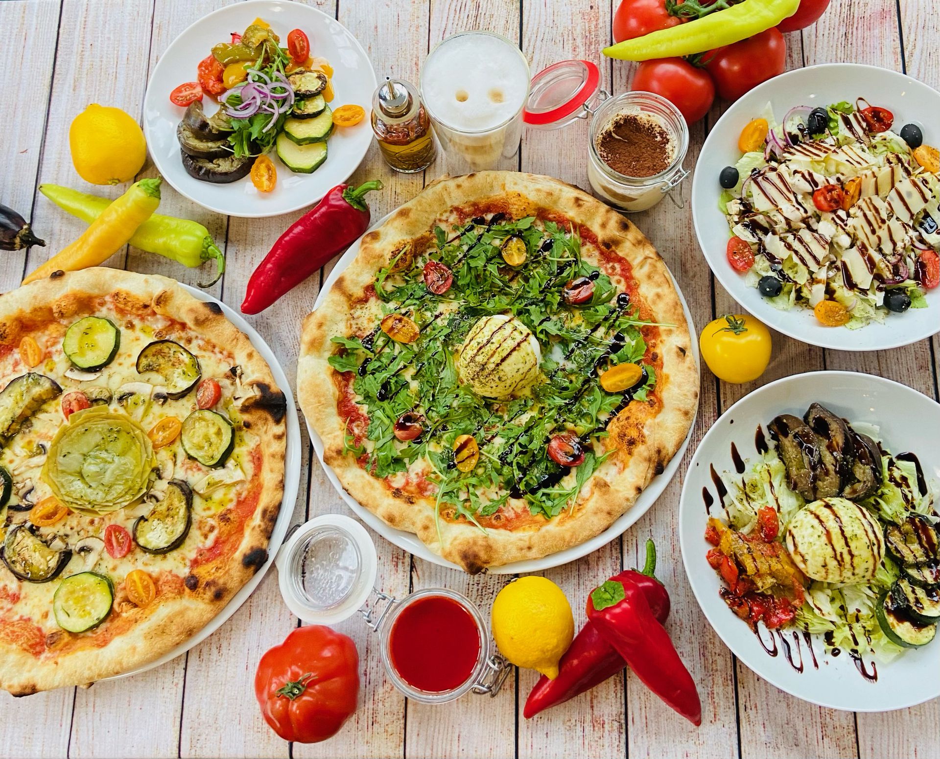 Dégustez nos meilleures pizzas, pâtes, salades, desserts, cocktails, vin et bières, sur place dans un cadre agréable, cosy en intérieur, dans une salle climatisée.