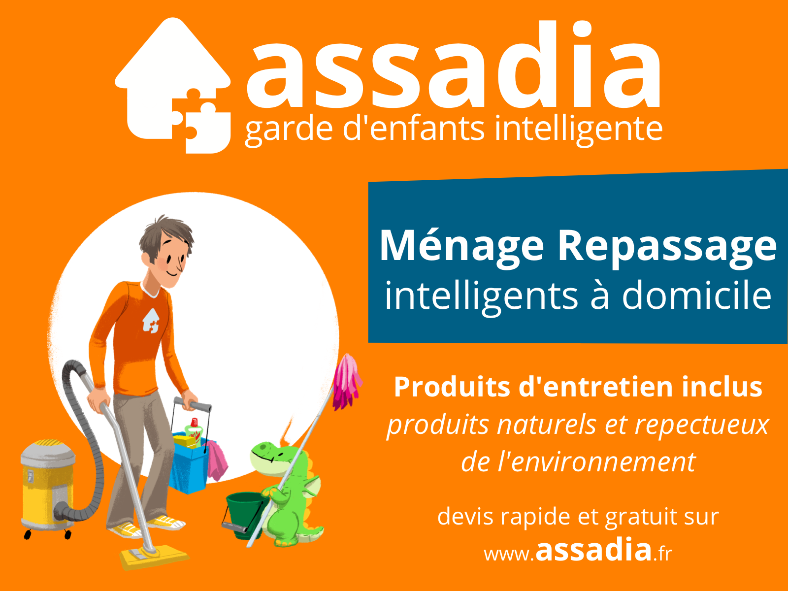 Assadia vous propose sur Montbrison & ses environs un service de garde d'enfants à domicile intelligente avec mallette contenant jeux, livres et activités. Sorties d'école, de crèche, le mercredi, pendant les vacances, le matin, le midi, soir, il y a toujours une raison pour faire garder ses enfants. Prenez du temps pour vous, soyez disponibles pour des moments de qualité pour eux. Logistique de fin de journée assurée. Service centré sur l'enfant, ses besoins, ses apprentissages. Également, service de ménage repassage à domicile intelligents avec produits d'entretien écologiques inclus.