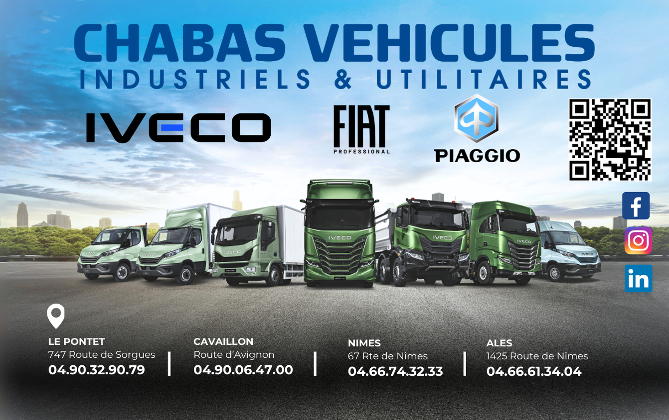 Chabas Véhicules Le Pontet est le site principal du groupe CHABAS/ DEVANCE, acteur incontournable dans la vente et l'entretien de véhicules utilitaires et poids lourds dans le Vaucluse. Installé au 747 route de Sorgues, le site propose une offre complète : vente de véhicules neufs IVECO, Fiat Professional et Piaggio, un large choix de véhicules d'occasion toutes marques, un atelier mécanique et carrosserie, un service de peinture, un magasin de pièces détachées constructeurs et multimarques, ainsi qu'un service de location courte et longue durée.