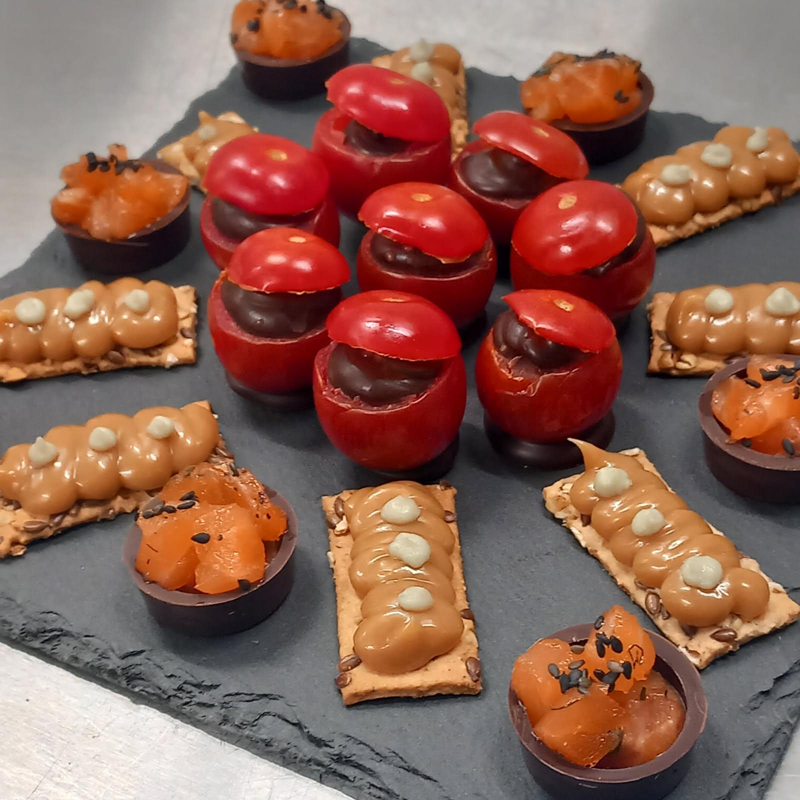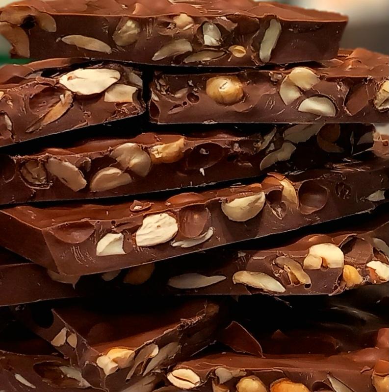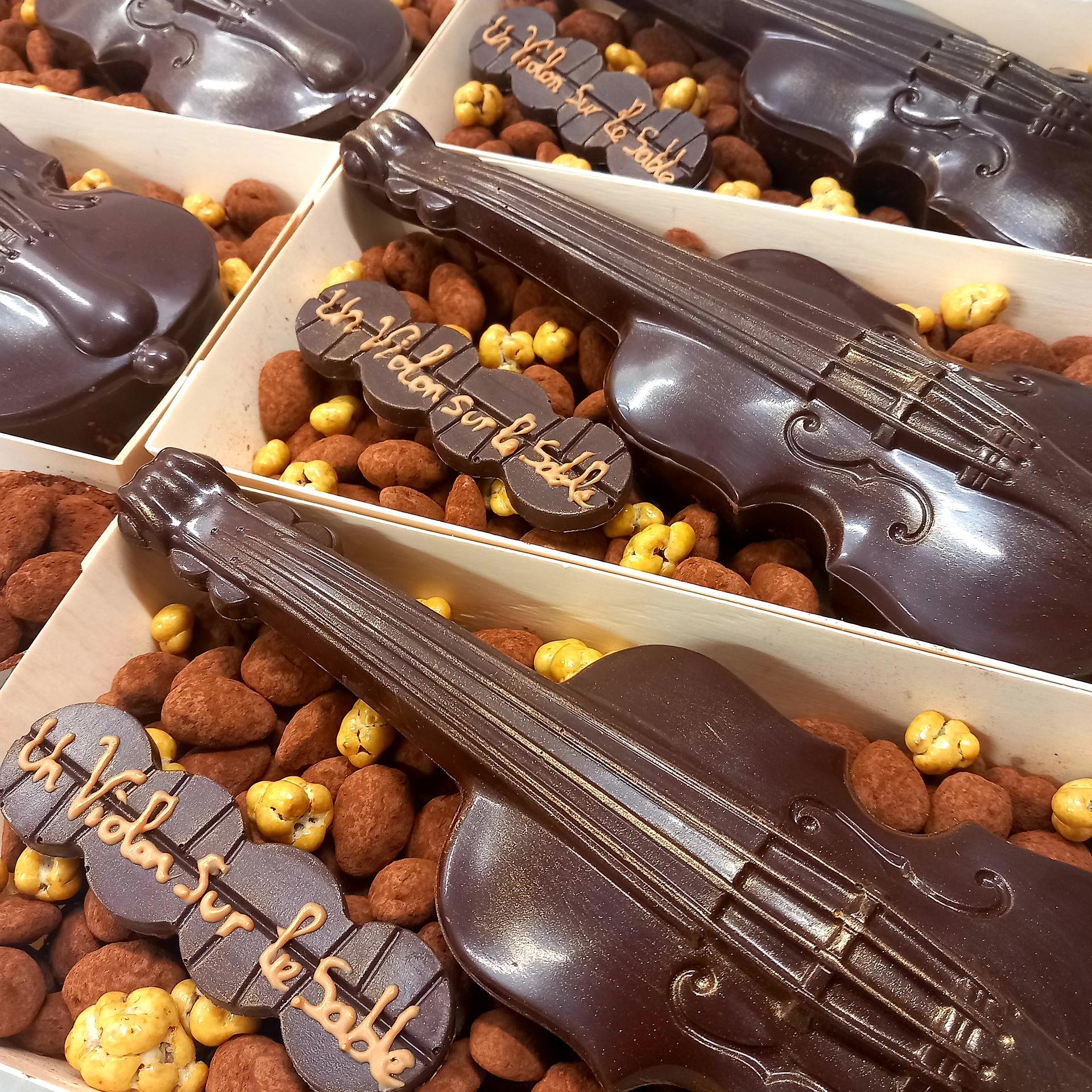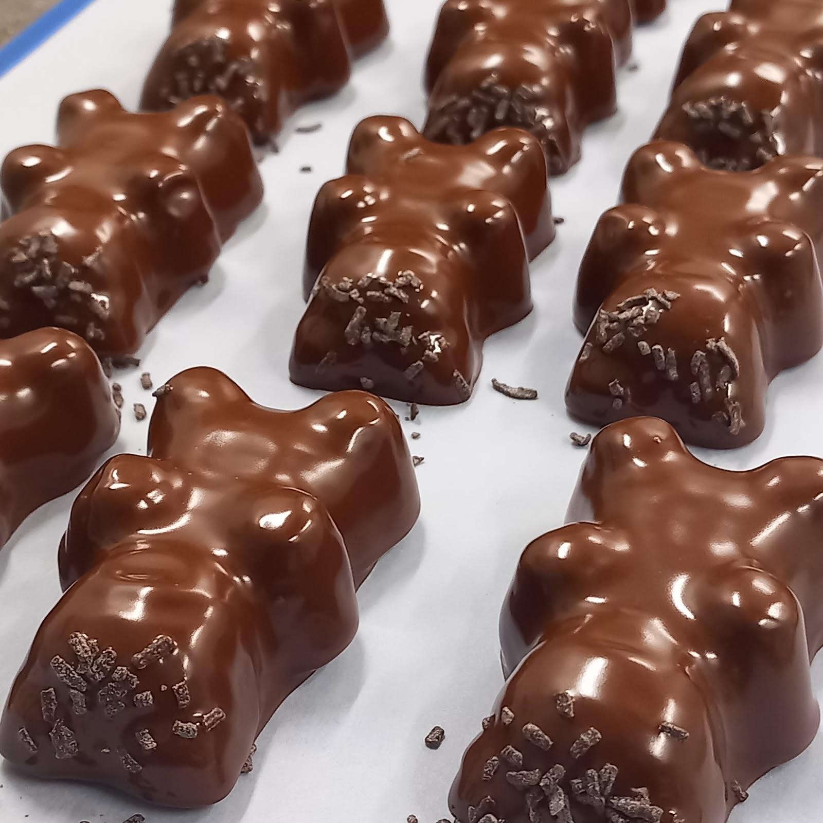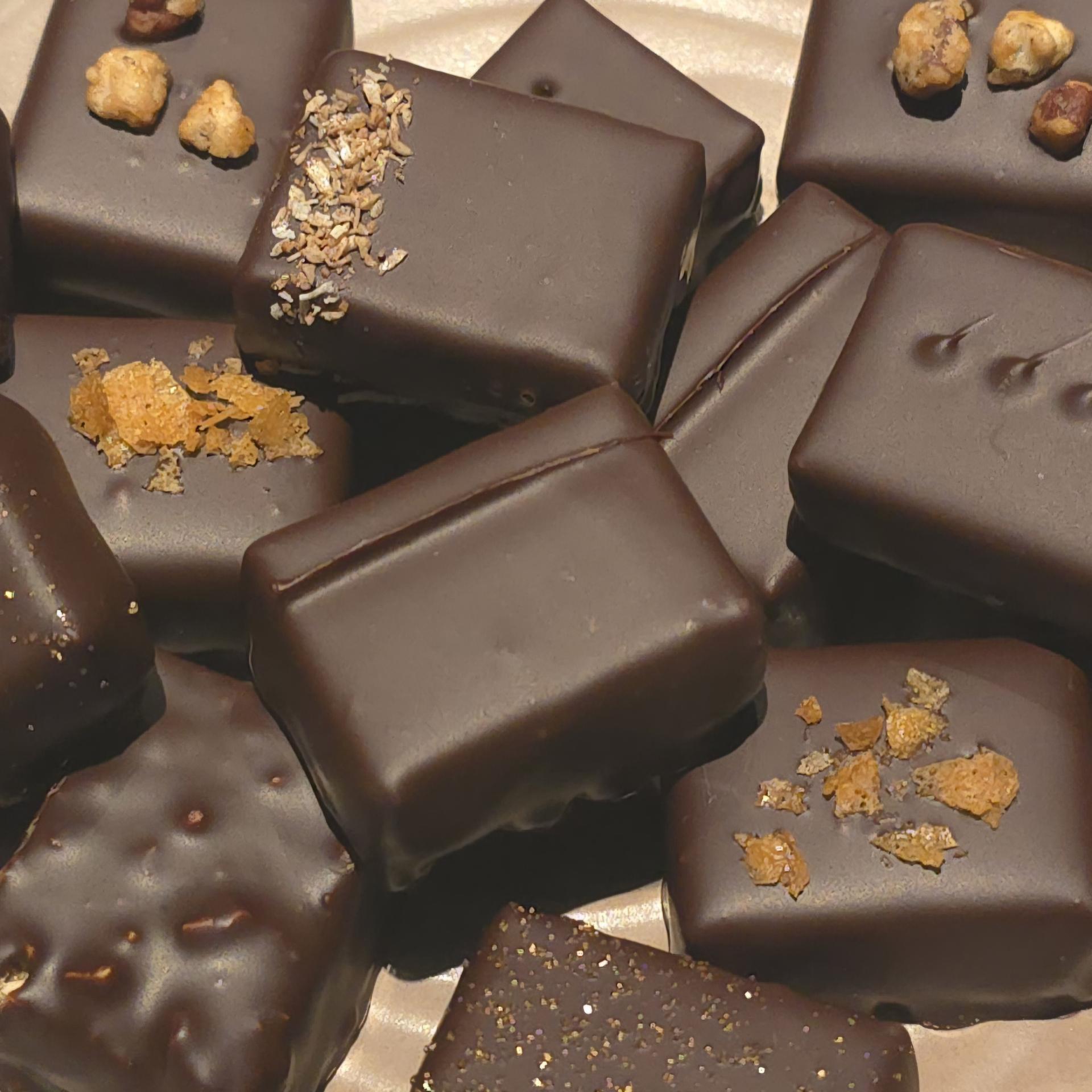 Adeline, chocolatière réalise Tablettes de chocolat, bonbons de chocolat fins, grignotage, pâtes de fruits selon saison des fruits,dragées, calissons, nougats... et même des chocolats apéritifs étonnants.