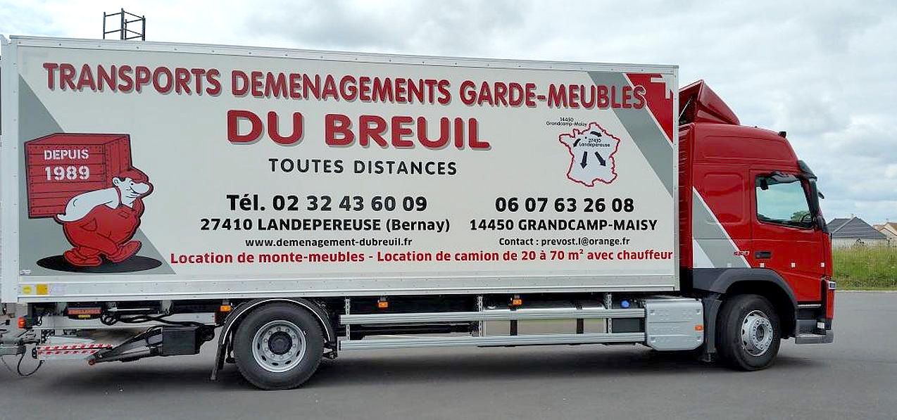 Situé à Grandcamp maisy, déménagements du breuil est à votre disposition pour vous aider dans votre déménagement. Nous vous proposons des camions avec chauffeur aussi bien pour les particuliers que pour les entreprises. Pour le stockage de vos biens, des containers individuels plombés et surveillés sont à votre disposition pour un tarif fixé au mètre cube. Nous souhaitons avant tout satisfaire notre clientèle par nos réactivités et notre disponibilité. N'hésitez pas à nous contacter pour plus d'informations.