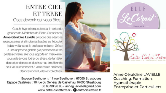 Entre Ciel et Terre permet aux hommes et aux femmes de libérer leur potentiel pour transformer leur façon d'être et d'agir en prenant en compte la dimension du bien-être. Je suis Anne-Géraldine LAVIELLE, hypnothérapeute et coach, je pratique aussi avec des approches telles que l'EFT, la méditation et la PNL. je vous aide à retrouver bien-être et confiance, grâce à des méthodes éprouvées.