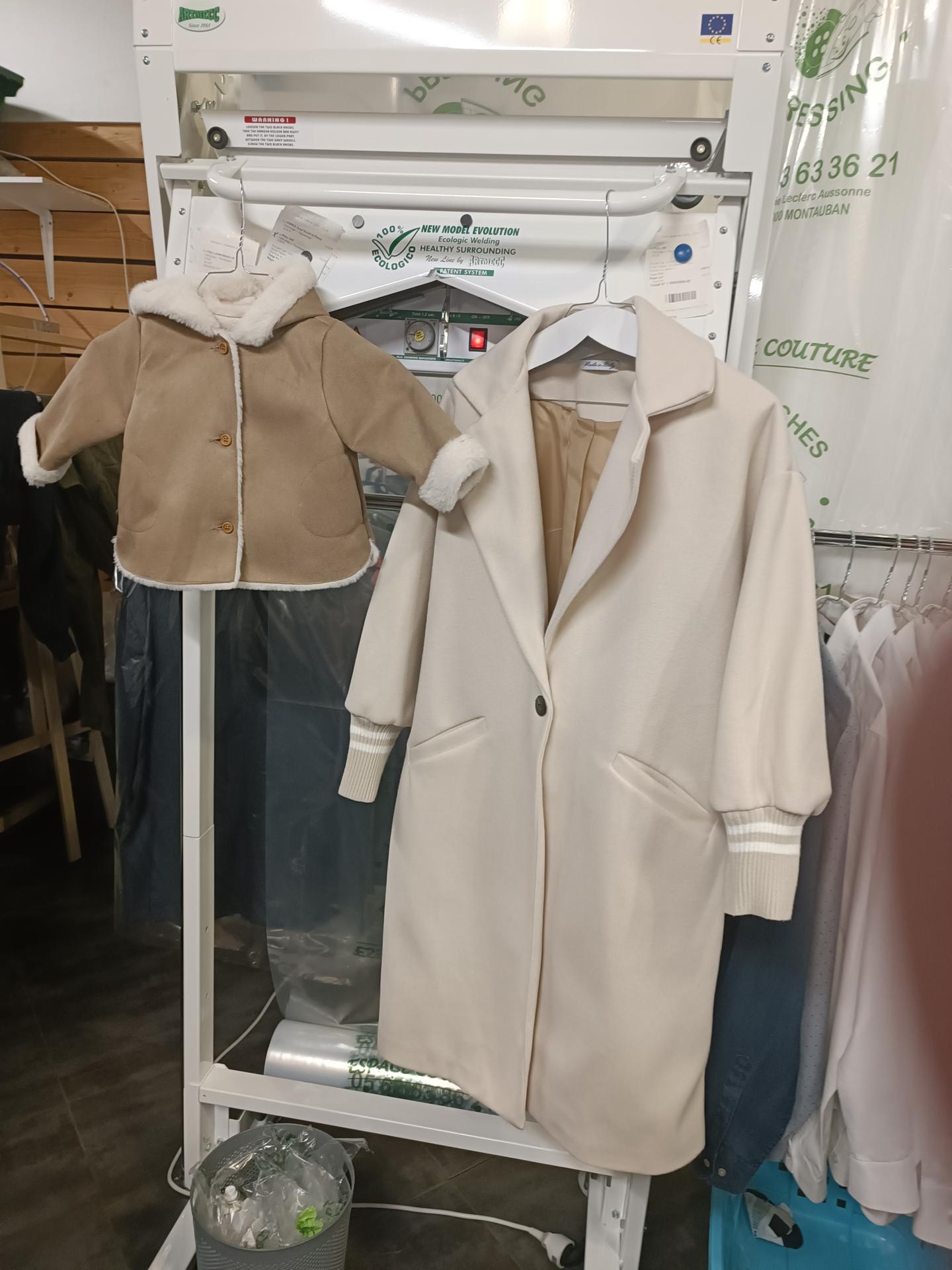 Pressing aqua avec désinfection et assainissement à l'ozone. Blanchisserie et repassage. Couture et retouches.