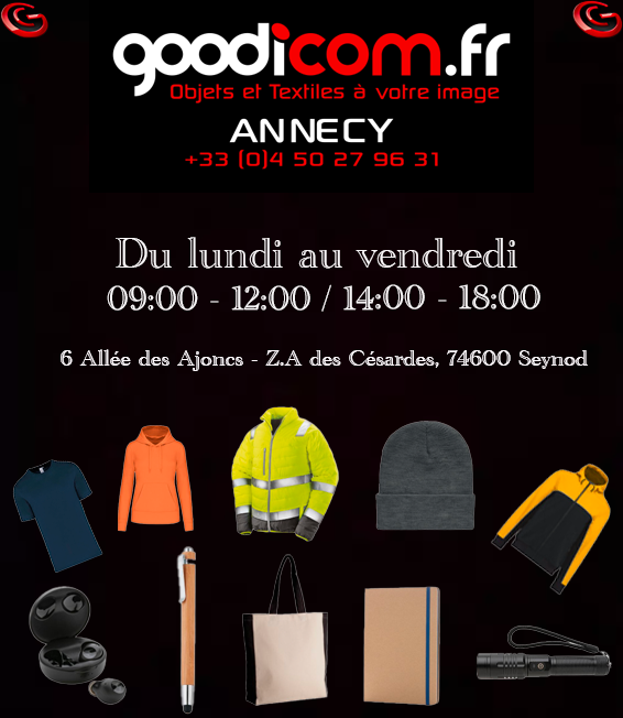 Un large choix d'objets publicitaires, stylos, parapluies, carnets, porte documents, sacs à dos . . . des vêtements personnalisés, tee shirts, polos, casquettes, doudounes, sweats, vêtements de travail. . . des cadeaux d'affaires,parure stylo, conférenciers, mugs isotherme, batterie nomade, sac de voyage . . Retrouvez-nous à Annecy-Seynod dans notre showroom à votre disposition.