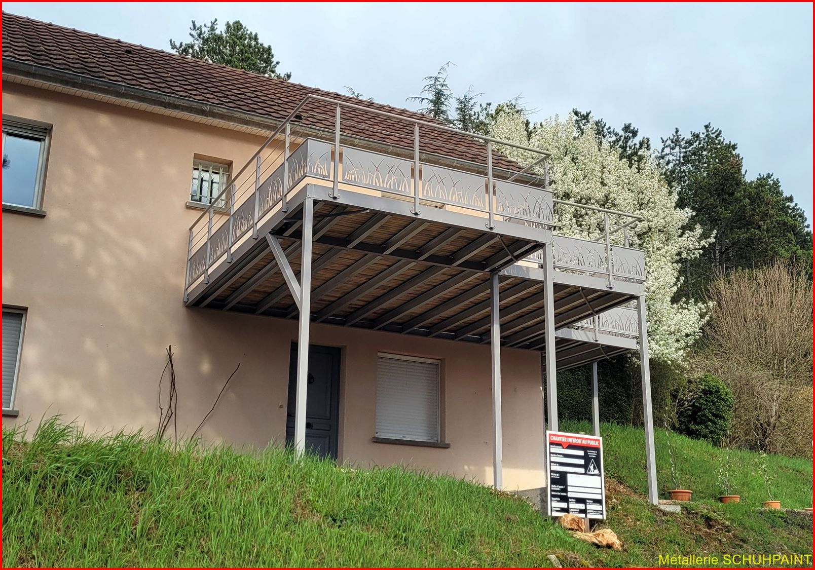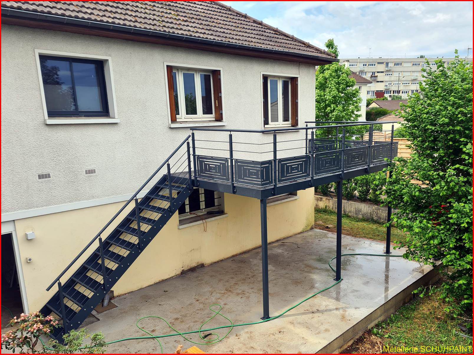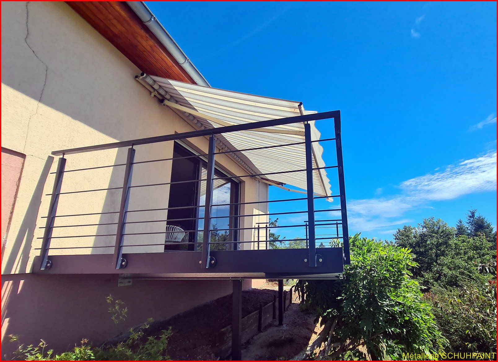 Métallerie Schuhpaint, 20 ans de passion au service de vos extérieurs ! Spécialisés dans la fabrication de terrasses métalliques sur pilotis ou goussets, nous créons des structures solides, élégantes et 100 % sur mesure. Depuis Marckolsheim, notre atelier transforme vos idées en réalité, avec un accompagnement complet : devis en ligne, plans 3D, bureau d'études intégré. Garde-corps, escaliers métalliques, rampes... on vous suit de A à Z. Faites confiance à un artisan local reconnu en Alsace et offrez à votre maison un vrai plus. On démarre quand ?